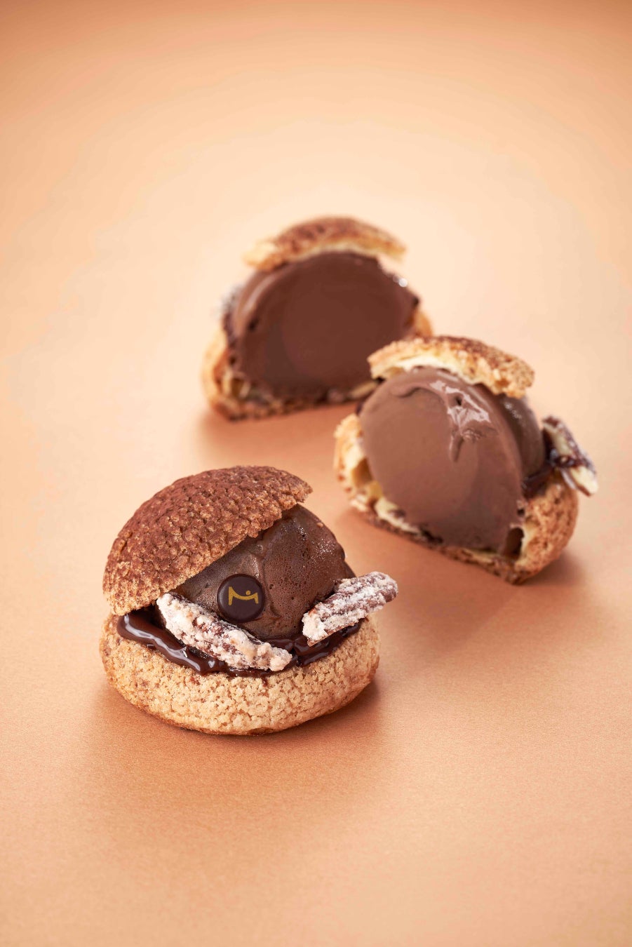 クッキーシューに濃厚なショコラのアイスを挟み、糖衣かけのピーカンナッツとチョコレートソースで仕上げたシューアイス。