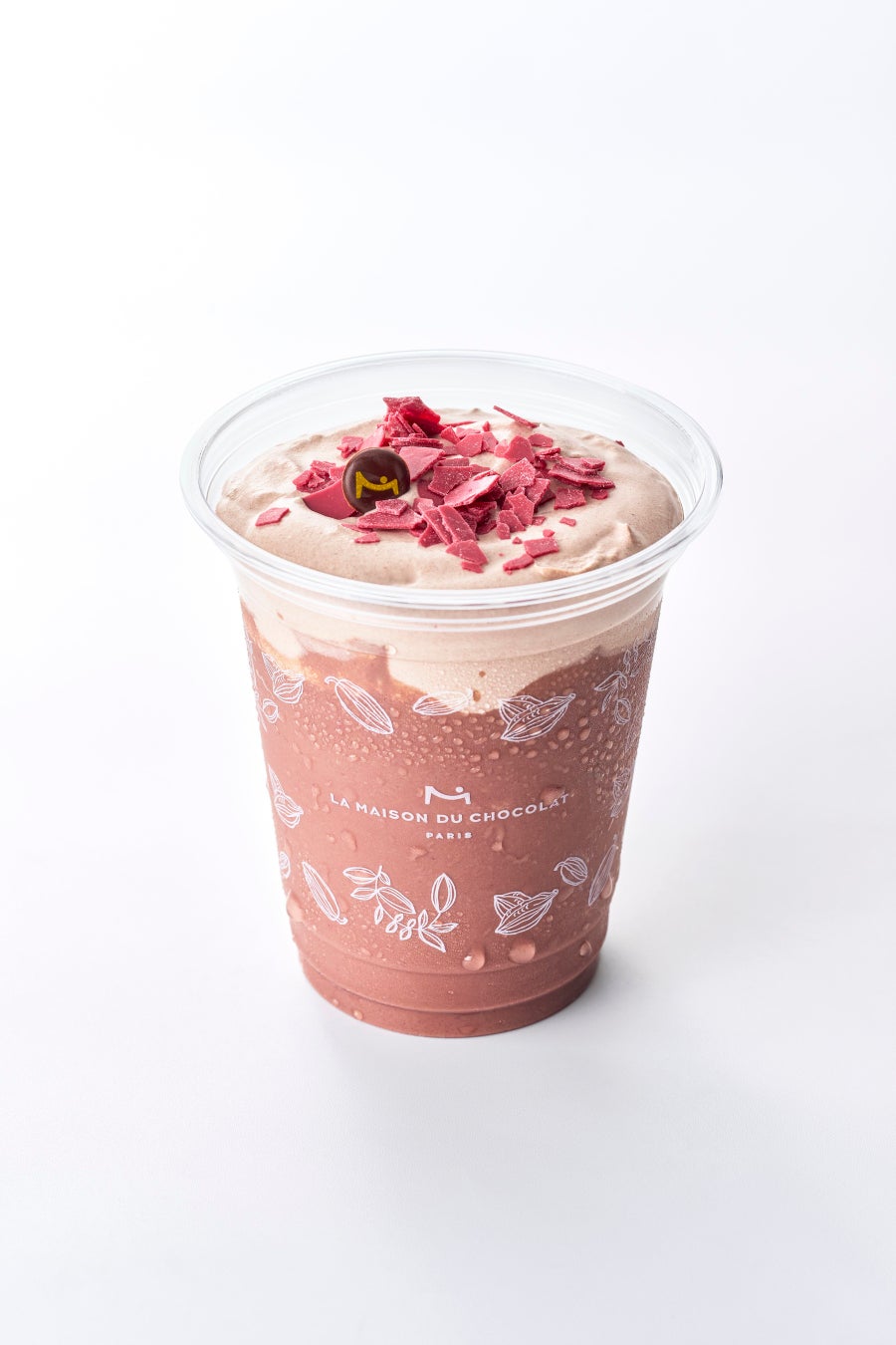 フランボワーズ風味の「ソルベ フランボワーズ」と「ショコラ グラッセ」を合わせた、甘酸っぱいフランボワーズ&ショコラのアイスドリンク。