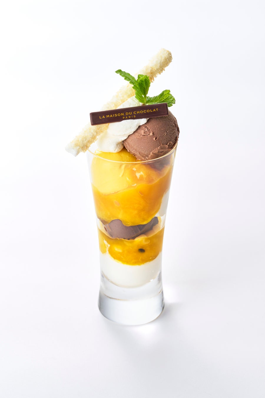 ココナッツ風味のクリーム、パッションフルーツソースとマンゴーに、ショコラのアイスとマンゴー&パッションフルーツ風味のソルベを合わせたパフェ。