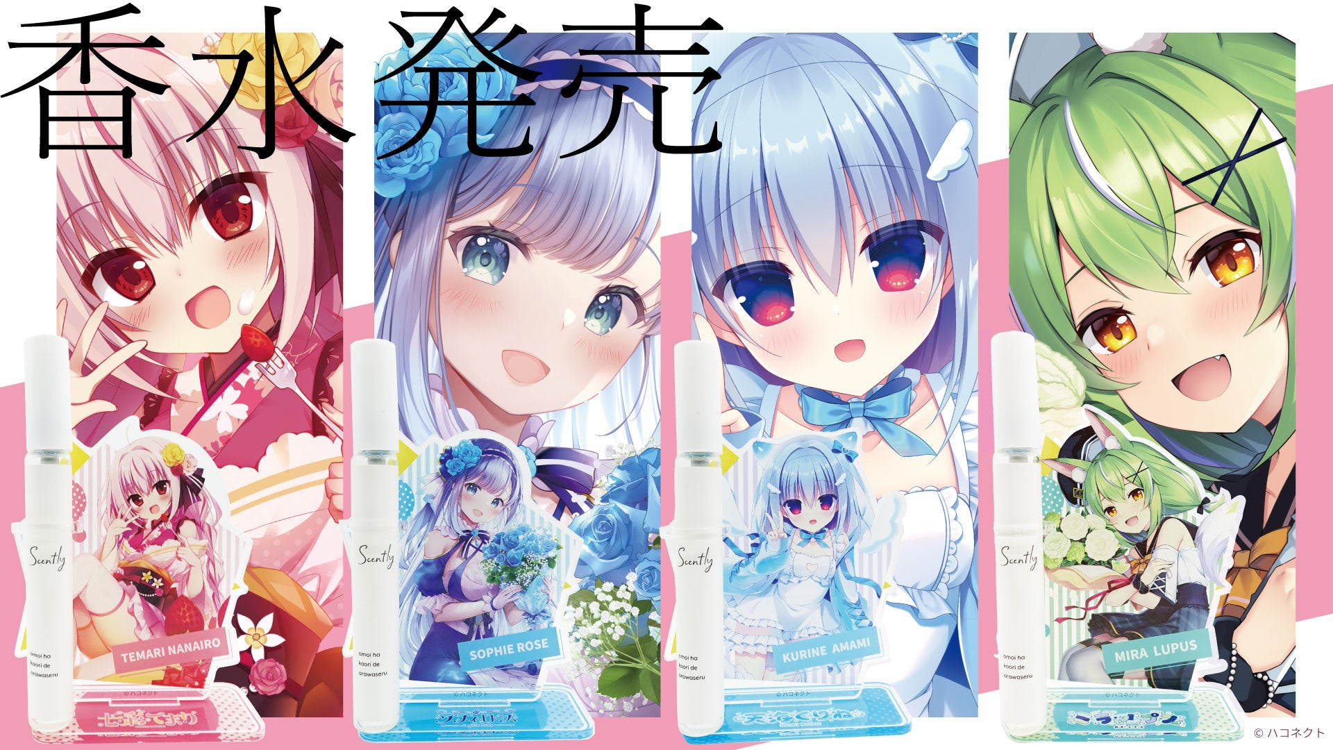VTuber事務所「ハコネクト」×「推し香水サービスScently(セントリー)」のコラボによる、七彩てまり、ソフィ・ローズ、天海くりね、ミラ・ルプスのイメージ香水が7月28日から期間限定で発売開始!