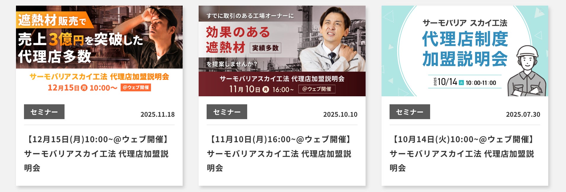 代理店制度の詳細や、サーモバリアの特徴、営業支援体制などについて詳しくご説明する「代理店加盟説明会」をオンラインにて定期開催しております。説明会では、実際の施工事例や代理店様の成功事例もご紹介し、ご質問にも丁寧にお答えいたします。