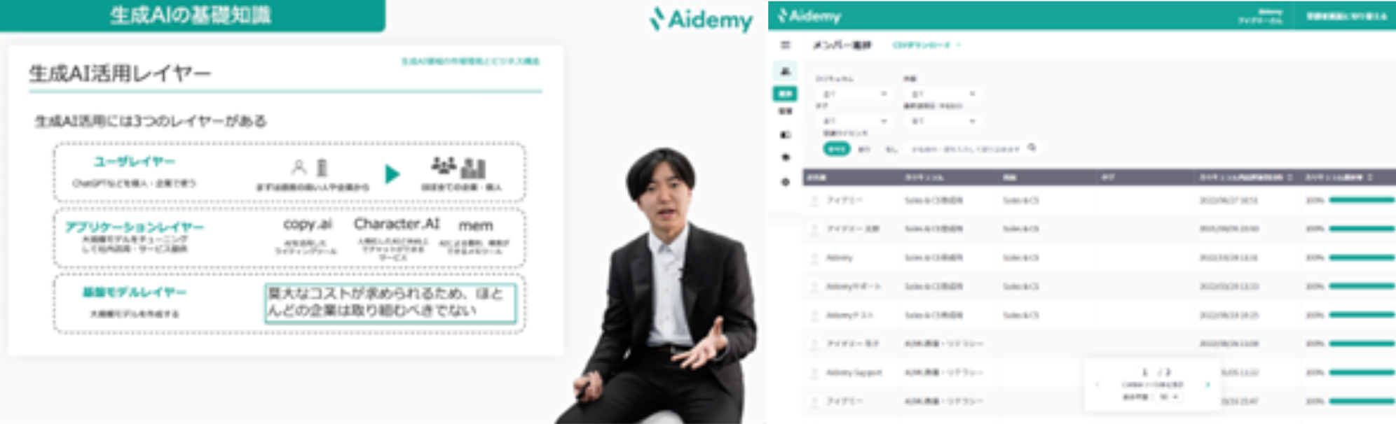 Aidemyの画面の例(左:neoAIが講師を務める生成AIのコース画面, 右:Aidemy Business 利用者向けの管理画面)
