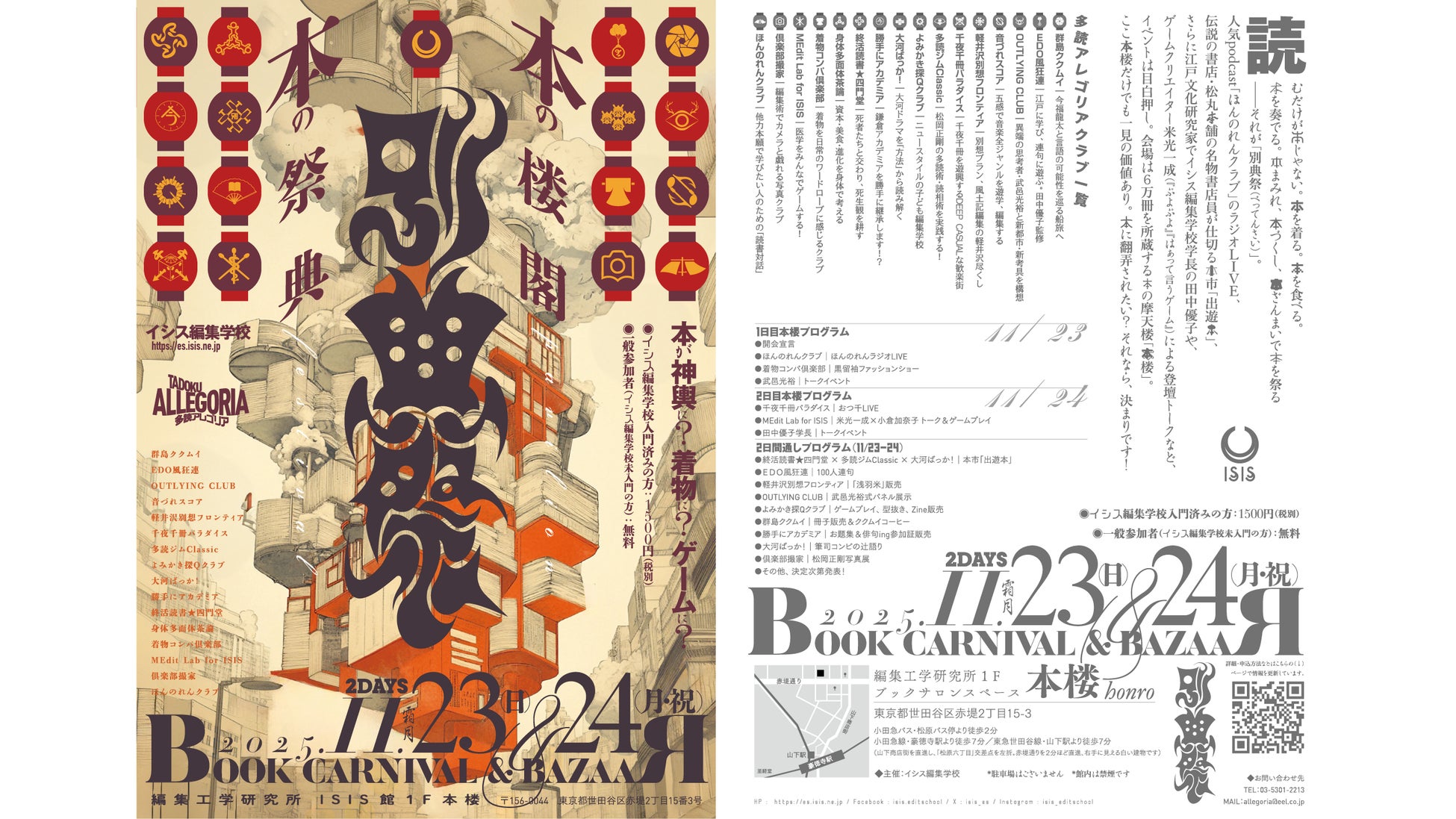 また、11月23日~24日には、イシス編集学校のブックサロンスペース「本楼」(東京・豪徳寺)にて、新しい本の祭典「別典祭」を開催。2024年12月からはじまった、本をテーマに多彩な活動を展開する[多読アレゴリア]のクラブが主催します。本を軸にしながら医療、着物、音楽、写真、終活などのテーマ性、鎌倉、軽井沢、沖縄などの地域性のある16のクラブが出展、トークイベント等を実施します。伝説の書店である松丸本舗ブックショップエディターによる古本市も開催。豪徳寺ISIS館の全館をつかった本の福袋や本の相談コーナー、本にまつわる展示なども常設します。人気ポッドキャストほんのれん、おっかけ千夜千冊ファンクラブのライブ配信、田中優子氏による江戸と書物、メディア美学者の武邑光裕氏のトーク、ゲームクリエイター米光一成氏と順天堂大学病理医・小倉加奈子氏のゲームと医療のセッションなど、これまでのブックフェアやコミケとは一線を画する企画を展開します。