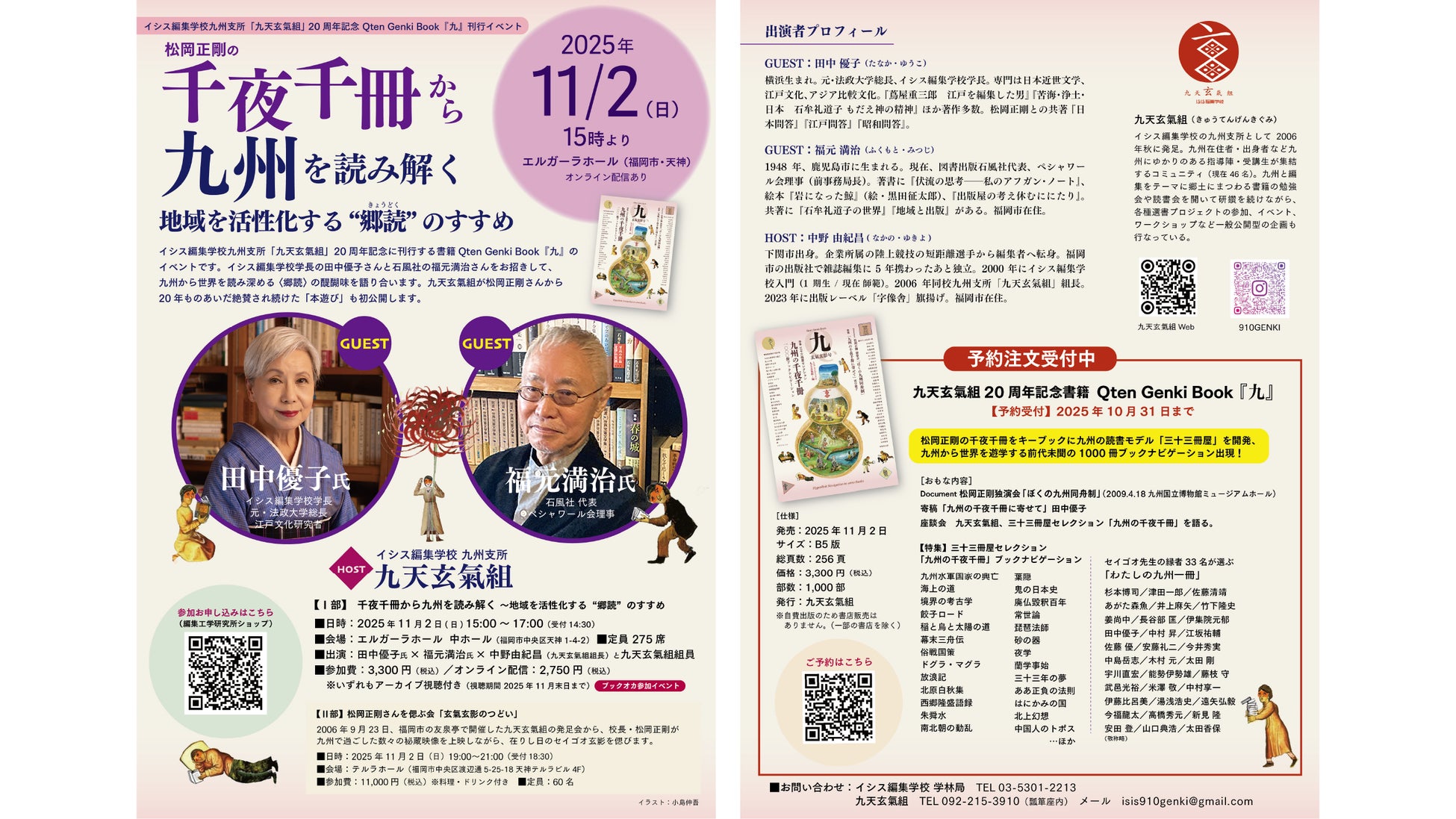 イシス編集学校九州支所「九天玄氣組」は今年で20周年を迎えます。その集大成として、松岡正剛による「千夜千冊」から選んだキーブックを軸に、九州らしさを浮き彫りにする1,000冊のブックナビ書籍としてQten Genki Book 『九』を刊行します。これを記念し、刊行イベントを開催します。九州を拠点に出版活動を行う石風社代表でペシャワール会理事の福元満治氏と、法政大学名誉教授、江戸文化研究者であり、イシス編集学校学長の田中優子をゲストに、トークを予定しています。 読書離れが進んでいるといわれる今こそ、自分のルーツを掘り進める郷読の必要性を語り合います。地域を読み解くための読書の方法は、九州以外でも活用できます。