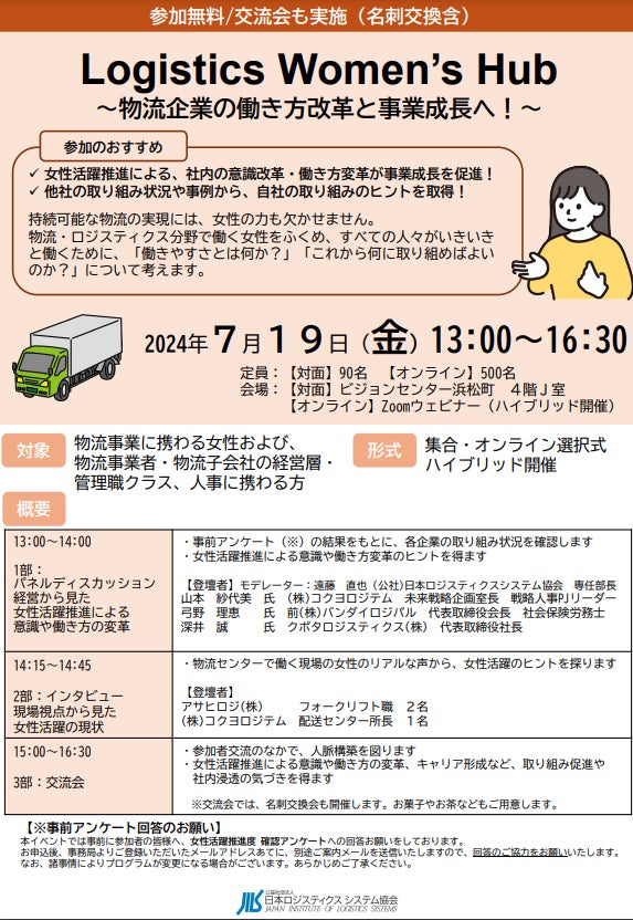 誰もが働きやすい物流・ロジスティクス業界をつくるための第一歩として、女性活躍推進を目的としたイベントを開催します。現場の女性のリアルな声や登壇企業の推進事例にふれて自社の取組みのヒントを取得いただけるほか、企業同士の交流により、ネットワークの形成に役立てていただけます。