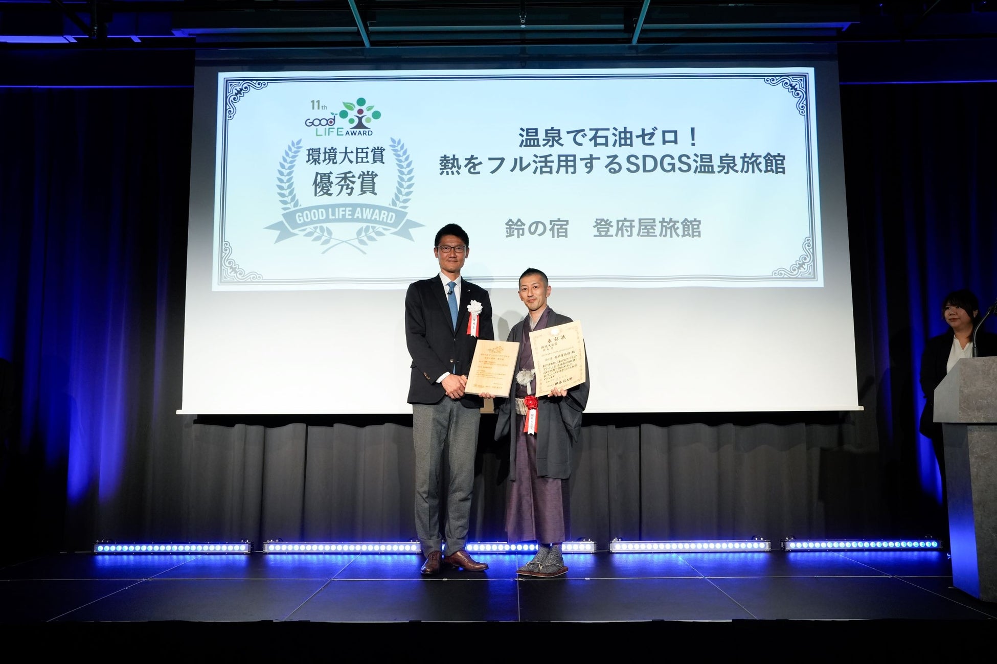 2023年12月2日、東京都渋谷区のスクランブルホールで受賞プレゼンテーションと表彰式が行われ、「鈴の宿 登府屋旅館」には環境大臣賞の賞状と盾が贈呈されました。