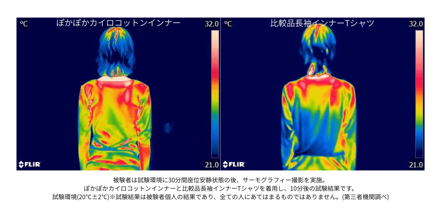 (※ISO18782,カケン法による吸湿発熱性試験に基づき、温感最大+3.7度の上昇が実証されています。)