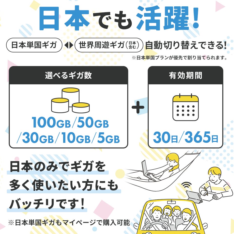 そこで、海外だけでなく、日本の普段使いでもONEワールドを体感いただけるよう、有効期間365日の世界ギガ5GBに、さらに日本で多く使える100GBを付けて販売いたします!