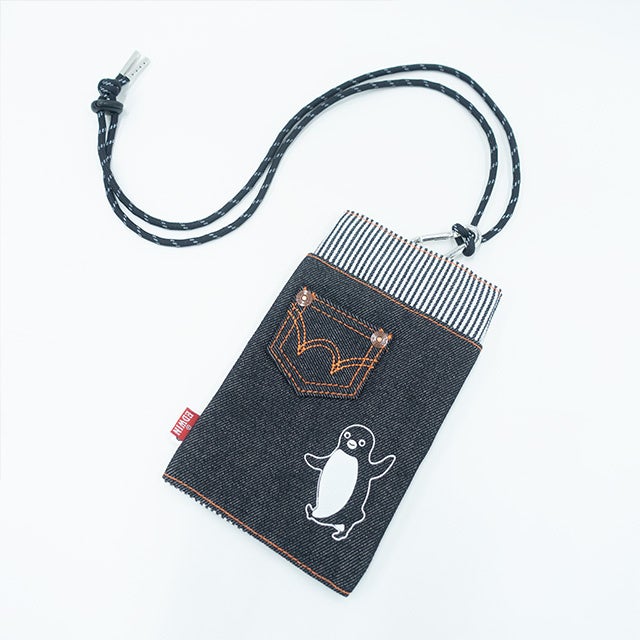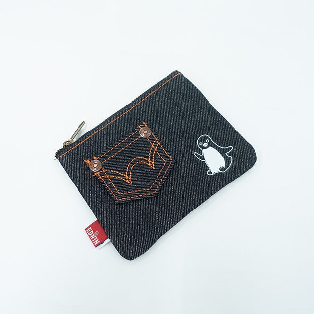 EDWINのブラックデニムとヒッコリー生地を使用。SuicaのペンギンのワンポイントとEDWINデニムを再現したポケット付き!リベットももちろんEDWIN製です!大きめスマホも入る使い勝手の良いサイズです。