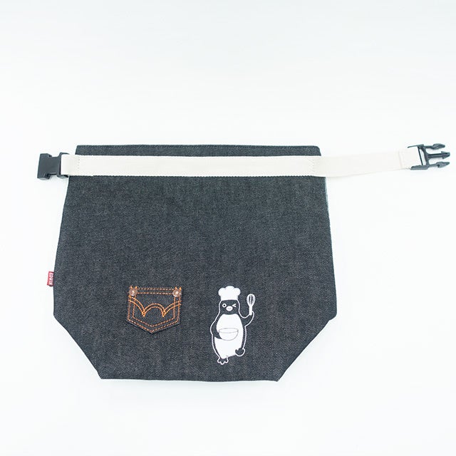 EDWINのブラックデニムとヒッコリー生地を使用。SuicaのペンギンのワンポイントとEDWINデニムを再現したポケット付き!リベットももちろんEDWIN製です!上部をくるくると巻いてカッチャン!サイズを調整できます。