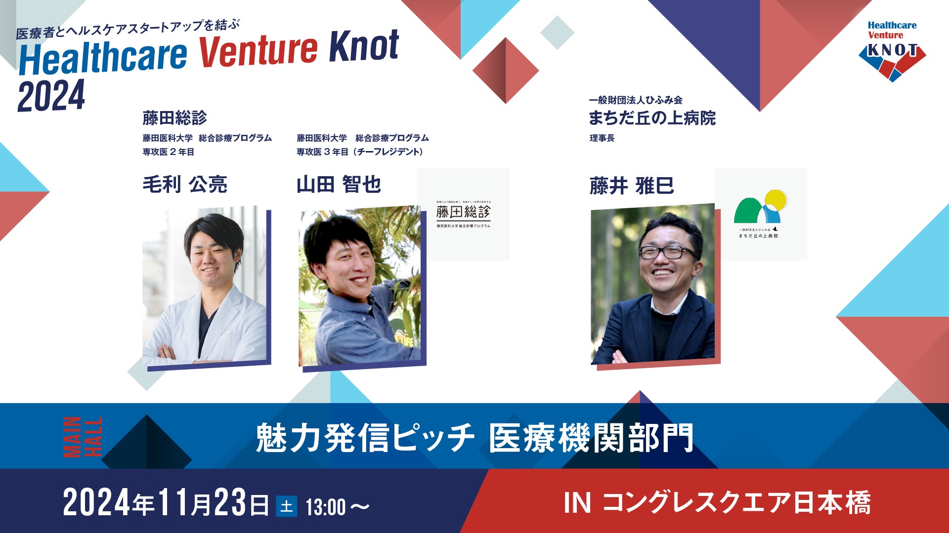 メイン会場では、自社・自院の魅力を語り尽くす「魅力発信ピッチ」や、医師芸人とおばあちゃん芸人による夢のコラボセッション、さらには、インパクト起業家育成プログラム「Knot Program」に参加する起業家6名によるピッチコンテストを行います。