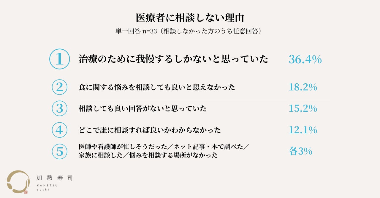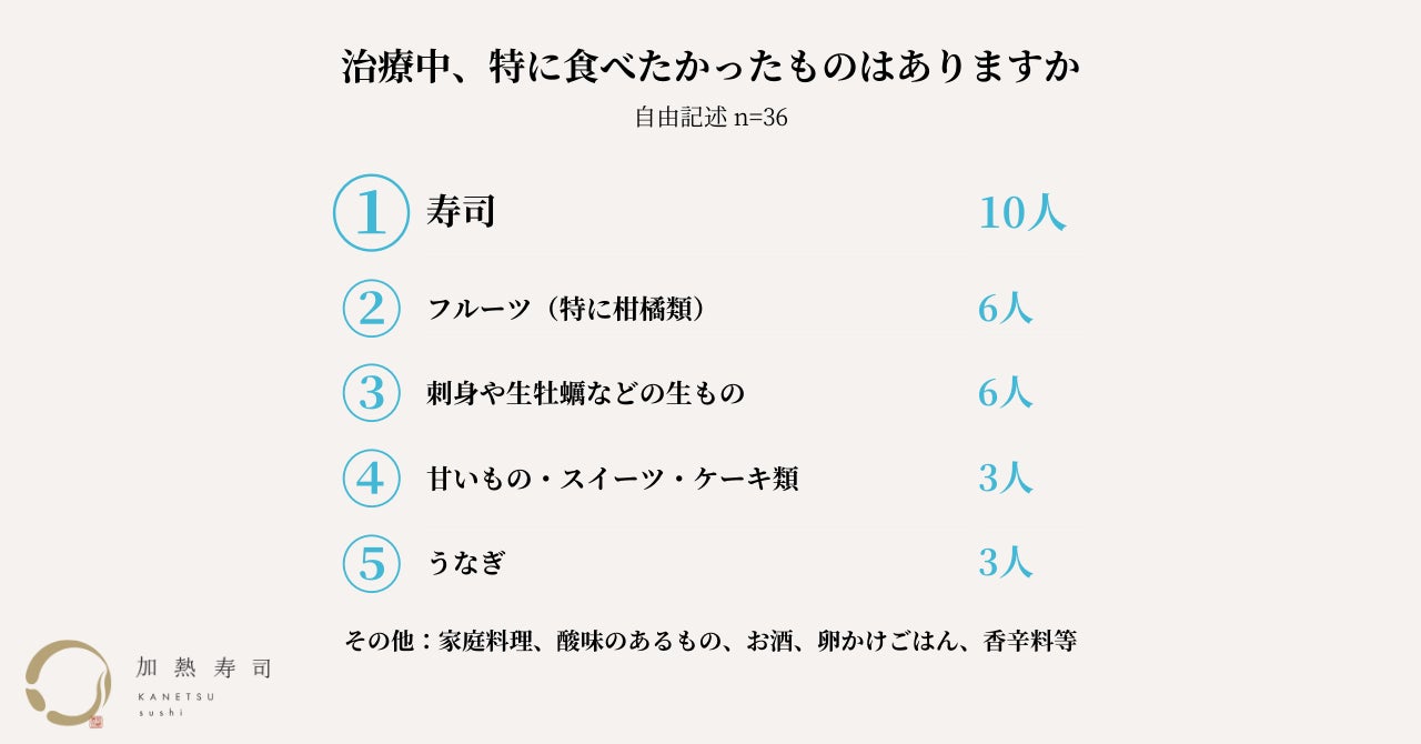 「治療中、特に食べたかったものはありますか」という設問では、寿司、フルーツ、刺身・生牡蠣という回答が続き、上位3つは全て生ものでした。