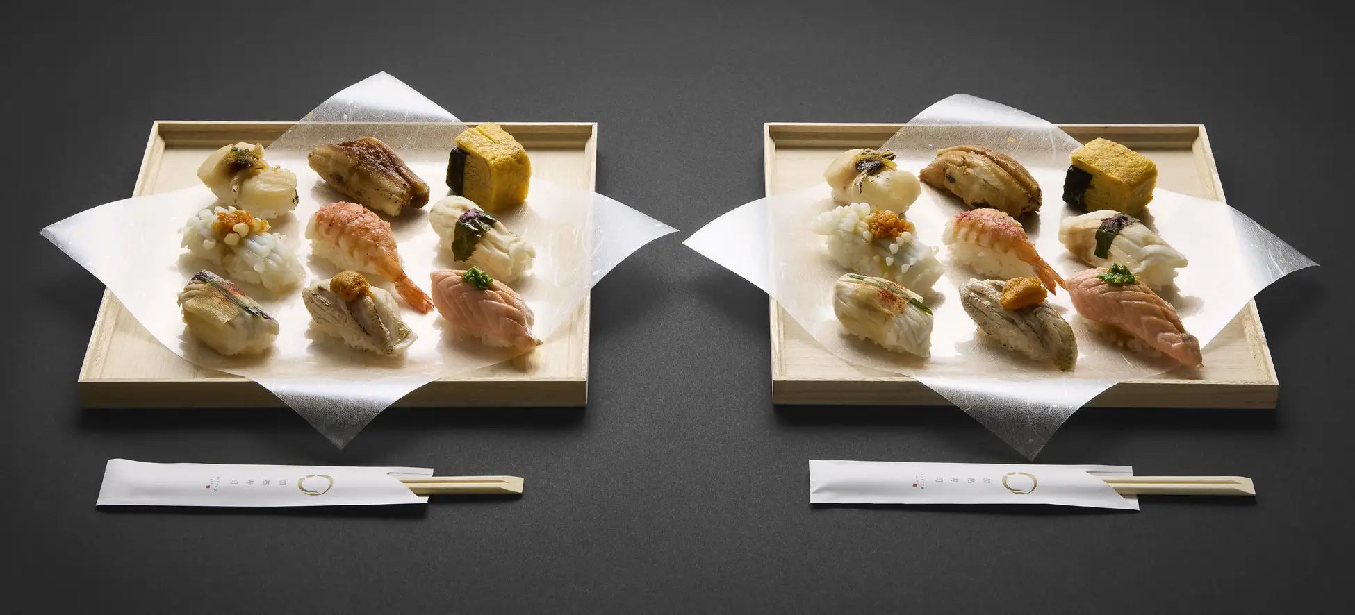 ・ネタ:サーモン、カンパチ、のどぐろ&ウニ、真鯛、穴子、イカ、海老、玉子焼き、ホタテの全9貫