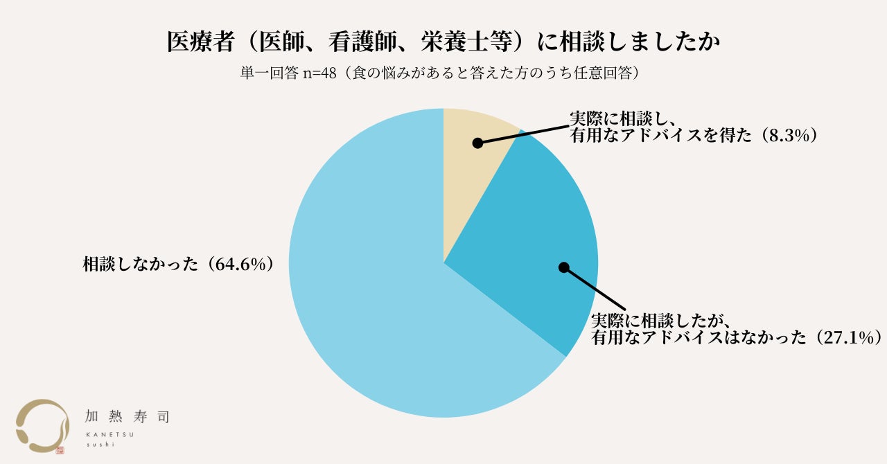 7割以上のがん患者が「食」についての不安を抱えているにも関わらず、「その不便や不安を解消する代替手段はありましたか」という設問に対し、55.6%が代替手段がなかったと回答。代替手段があり、実行した方は35.6%に留まりました。また、不安や悩みがあると答えた方のうち、64.6%が医療者に相談していませんでした。