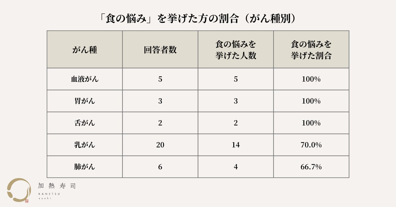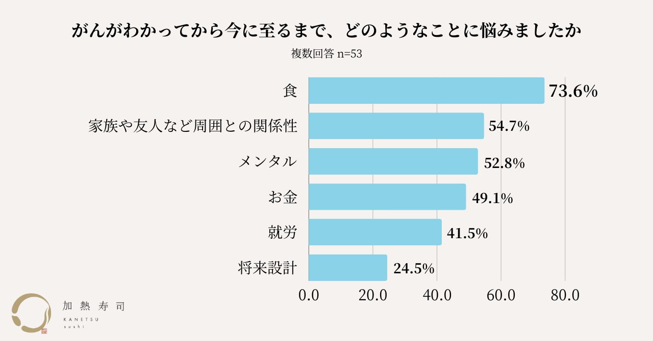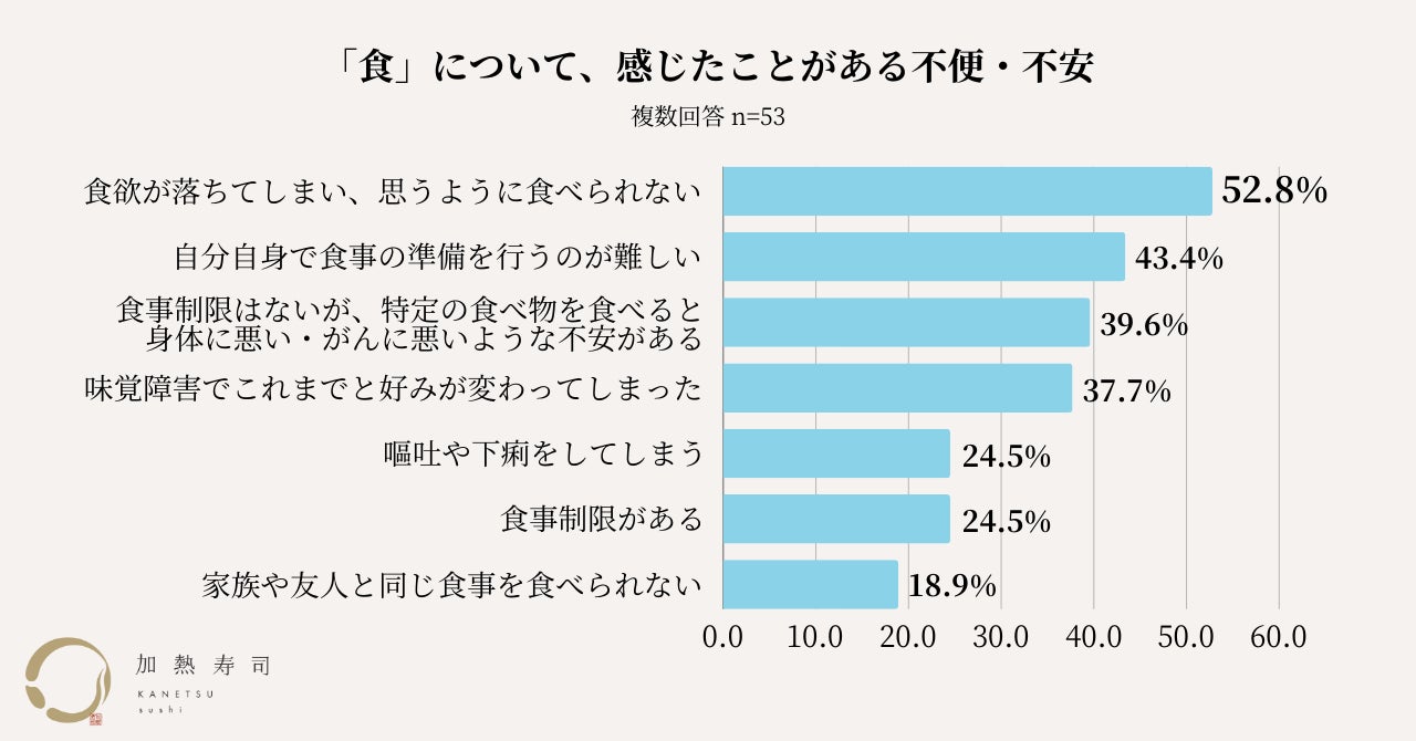妊娠中や病気の治療中など、生ものを控えている方でも安心して食べられる加熱したお寿司を販売する「加熱寿司」(かねつずし)は、30代〜60代のがん患者53名を対象に、意識調査を実施しました。