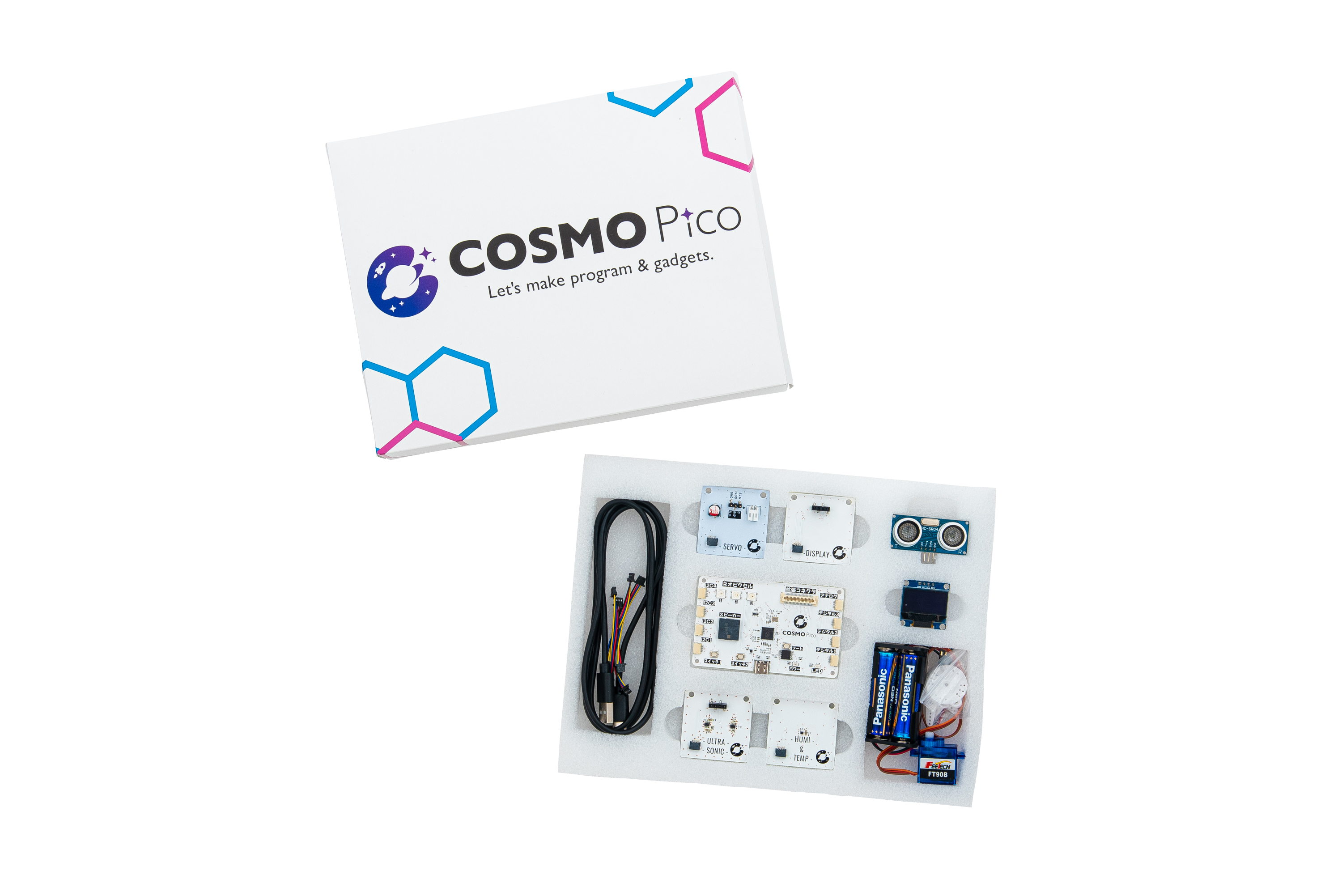内容:COSMO-Pico、COSMO-Editor(アドバンスプラン 1ヵ月分)、拡張ボード×4、ディスプレイ、サーボモーター、超音波センサー、湿温度センサー、ケーブル類、電池ボックス。