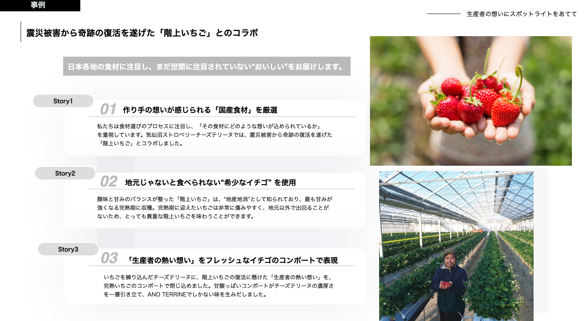 また、食材の想いを届けるD2C事業「ANO TERRINE」では、食材や農家さんの想いをチーズテリーヌにのせて全国へ届ける。