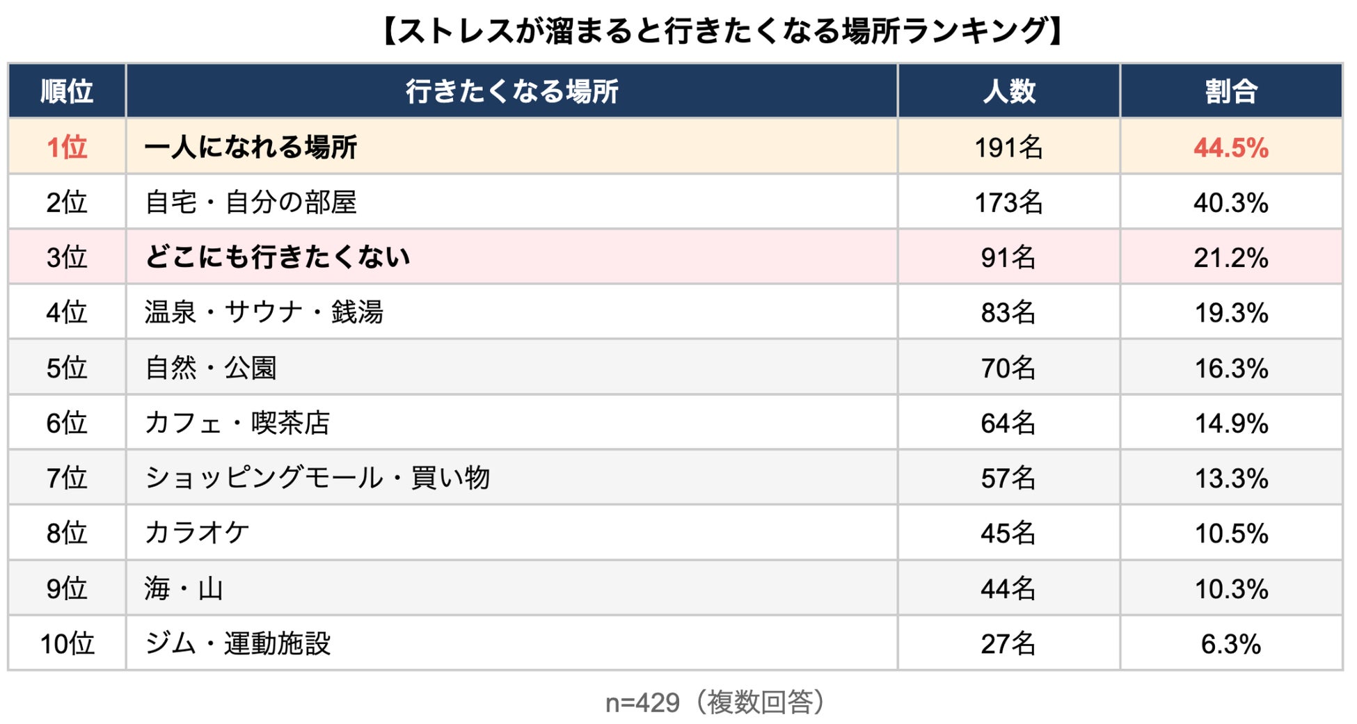 「ストレスが溜まると行きたくなる場所は?」(複数回答)と尋ねたところ、「一人になれる場所」が44.5%で1位となりました。「自宅・自分の部屋」(40.3%)よりも、「とにかく一人になれる場所」が求められていることがわかります。