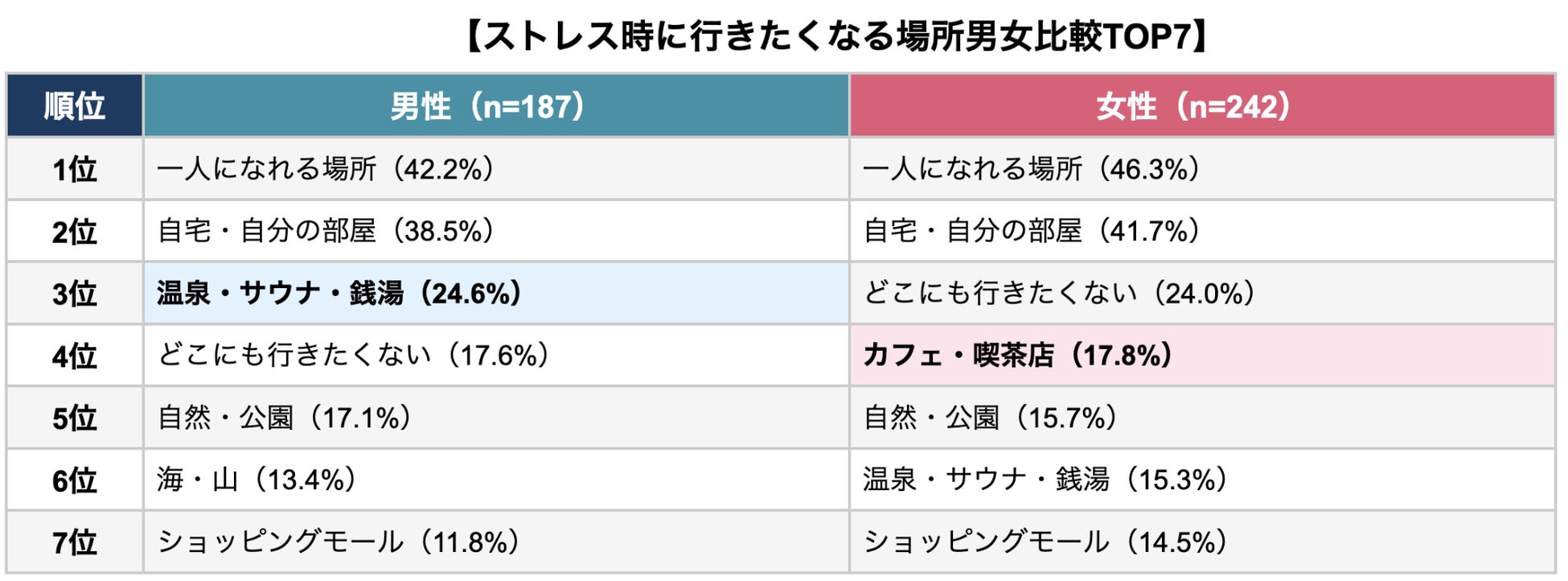 一方、女性は「カフェ・喫茶店」が4位(17.8%)に入り、男性(圏外)より高い傾向です。カフェで一人時間を過ごすことがストレス解消になっている女性が多いようです。