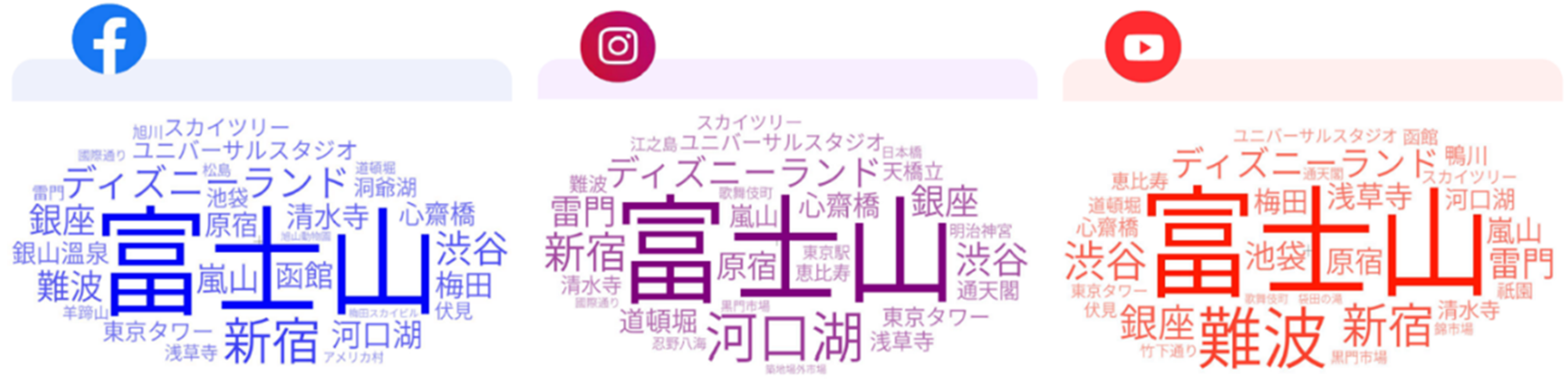 台湾のSNS上で影響⼒の⾼い⽇本の観光地について、Facebook、Instagram、YouTubeの3つで比較しました。