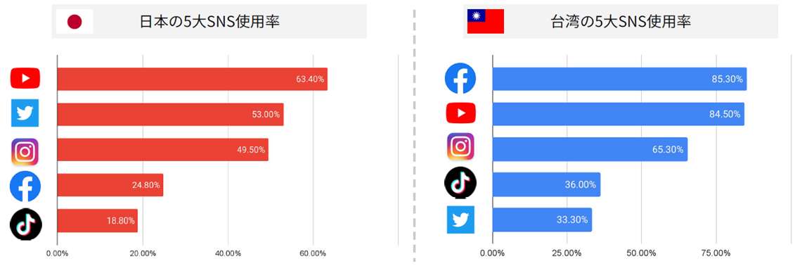 台湾では、5⼤SNSの使⽤率は全体的に⽇本よりも⾼く、特にFacebookの使⽤率が85.3%で、台湾人のほとんどが使⽤しており、24.8%の日本と⼤きな差があります。YouTubeは⽇本、台湾ともに⾼い使⽤率となっています。