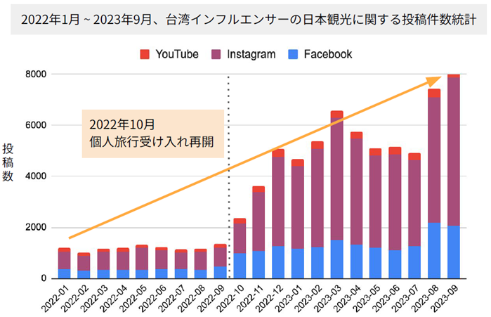 2022年10⽉に⽇本政府が個⼈旅⾏の受け入れを再開後、台湾インフルエンサーによる⽇本観光に関する投稿数が急激に増加しました。SNS投稿数は2023年9⽉の時点で、2022年1⽉と比較して8倍にまで増加しています。それぞれのSNSで見ると、Instagramでの投稿が最も多く、全体の約70%を占めています。