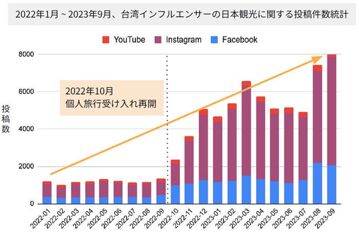 ●2022年10⽉に⽇本政府が個⼈旅⾏の受け入れを再開後、台湾インフルエンサーによる⽇本観光に関する投稿数が急激に増加しました。