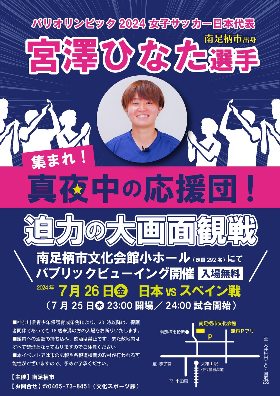 7月26日に開幕するパリ2024オリンピックのサッカー女子日本代表に選出された本市出身の宮澤ひなた選手を応援するため、パブリックビューイングを開催します。試合は予選グループの第1試合・スペイン戦で、市文化会館から宮澤選手へ声援を送ります。