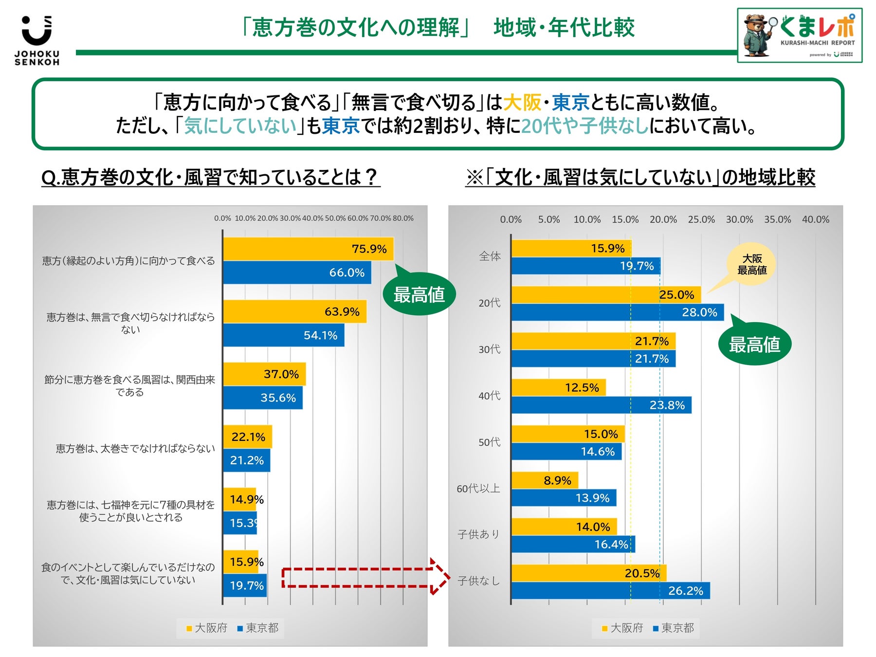 生活者の変化のキザシをとらえ、徹底的にエリアにこだわる"くらし・まちマーケティング®"を掲げる城北宣広株式会社(本社:大阪市北区、代表取締役社⻑:竹内俊文、以下「城北宣広」)は、2025年2月2日の「節分(恵方巻)」の実施状況を東京都・大阪府在住の既婚女性各1,000名・計2,000名に生活者調査を実施。その一部をくらし・まちレポート"くまレポ"としてお届けする。