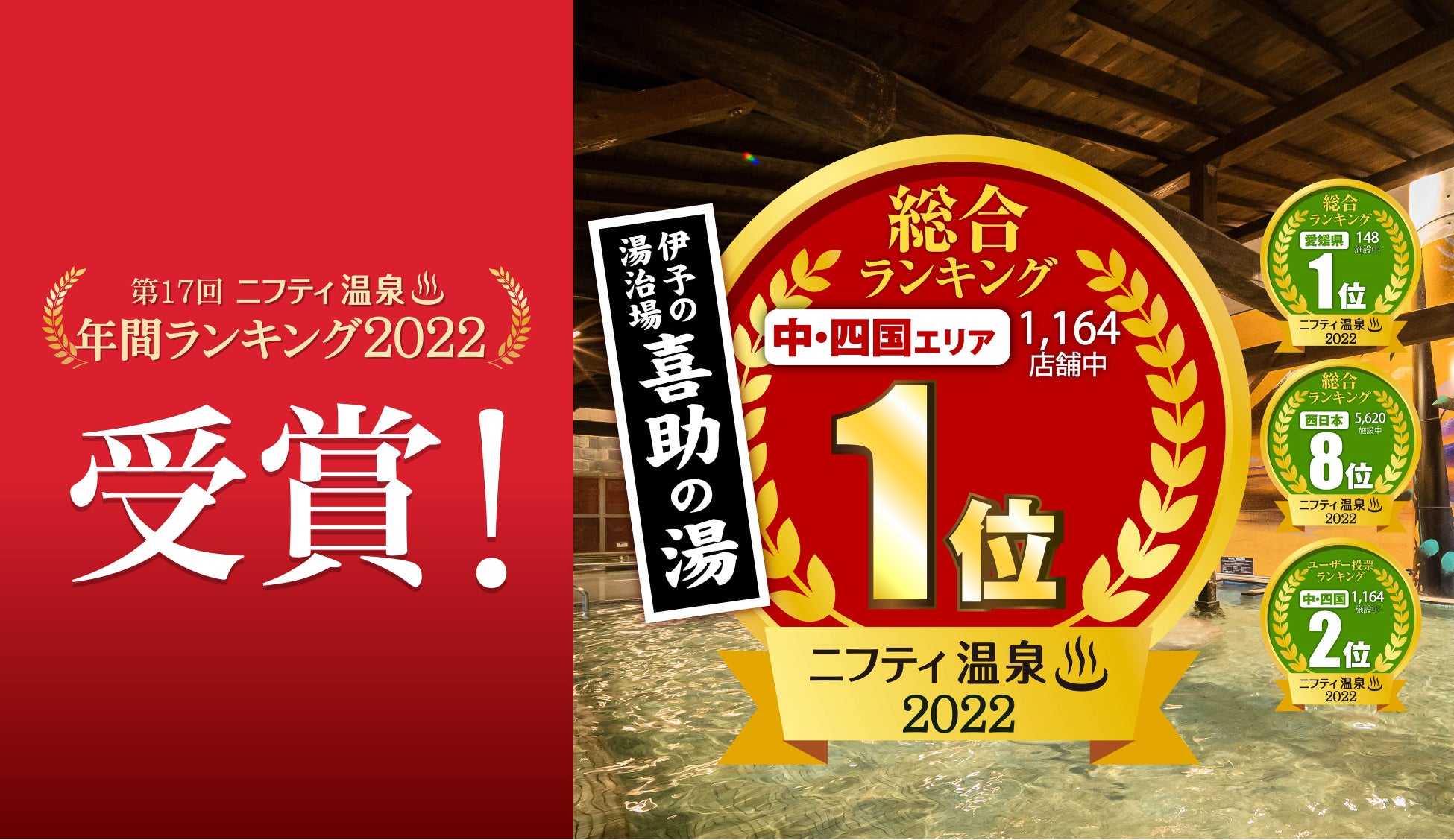 「伊予の湯治場 喜助の湯」(愛媛県松山市)、「しまなみ温泉 喜助の湯」(愛媛県今治市)が、2022年12月14日に発表された「ニフティ温泉年間ランキング2022」において数々の賞を受賞しました。