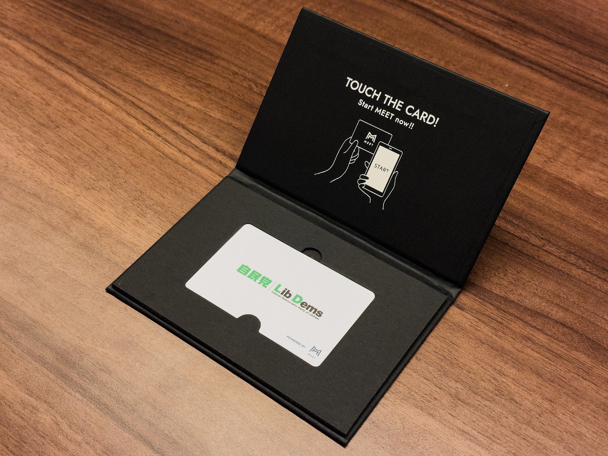 今回の配布は、自民党の党全国大会に先立って開催された、「自民党全国青年部長・青年局長合同会議」にて行われました。「自民党全国青年部長・青年局長合同会議」は、全国の青年局メンバーが一堂に会す合同会議で、会議に参加した自民党青年党員に自民党ロゴがプリントされたオリジナルデザインの「MEET CARD」が配布されました。