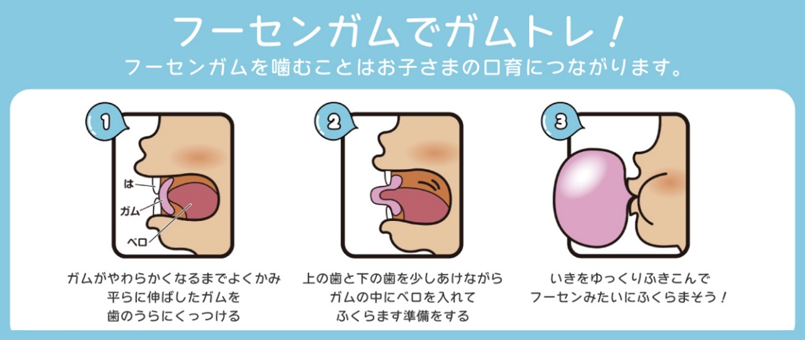 子どもの口周りの運動のためには、「シャボン玉」や「吹き戻し」など口をつかった遊びが効果的です。フーセンガムを膨らませることは「噛むこと」に加えて「舌を動かしてガムをまとめる・伸ばす」「口をしっかり閉じる」など、繊細な動きと筋肉運動が必要で口周りのトレーニングになると考えられます。