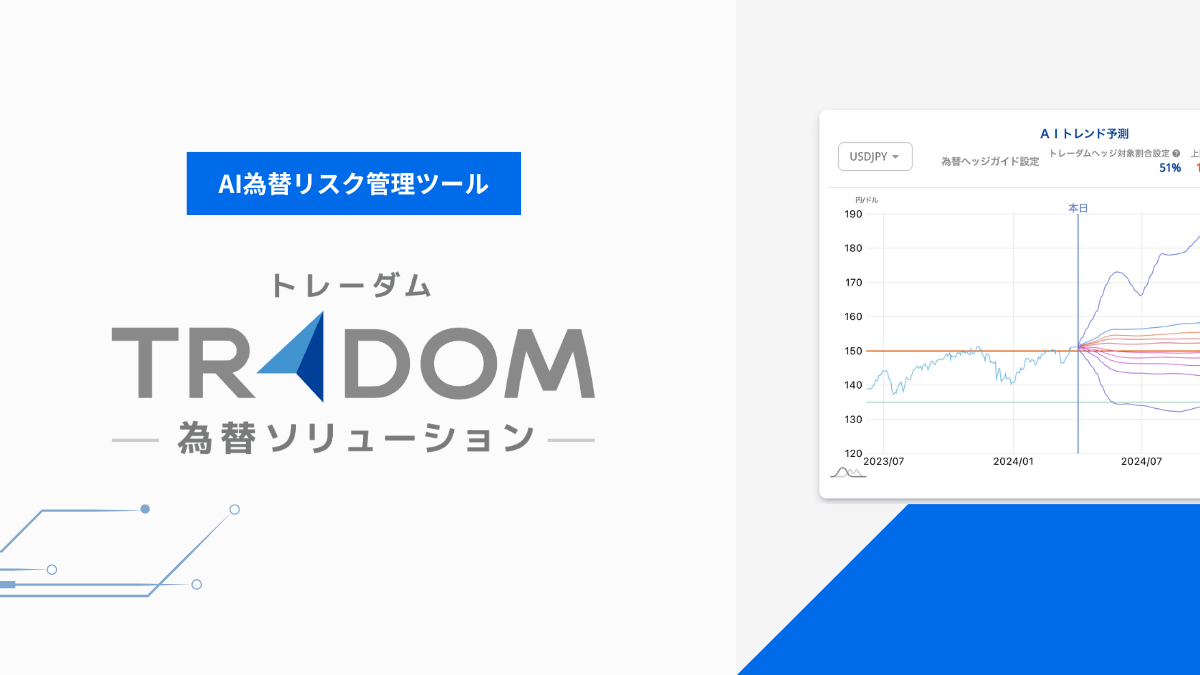 「トレーダム」は、海外取引のある企業が抱える外国為替変動リスクに関する課題を解決するクラウドサービスです。一部の大企業のみが持つ為替リスクをコントロールする仕組みを、高度なAI技術とITの活用により民主化。社内に為替のプロフェッショナルを持たない企業においても適切に為替リスクコントロールをし、企業の新たな為替リスクヘッジポリシーとして利用できます。