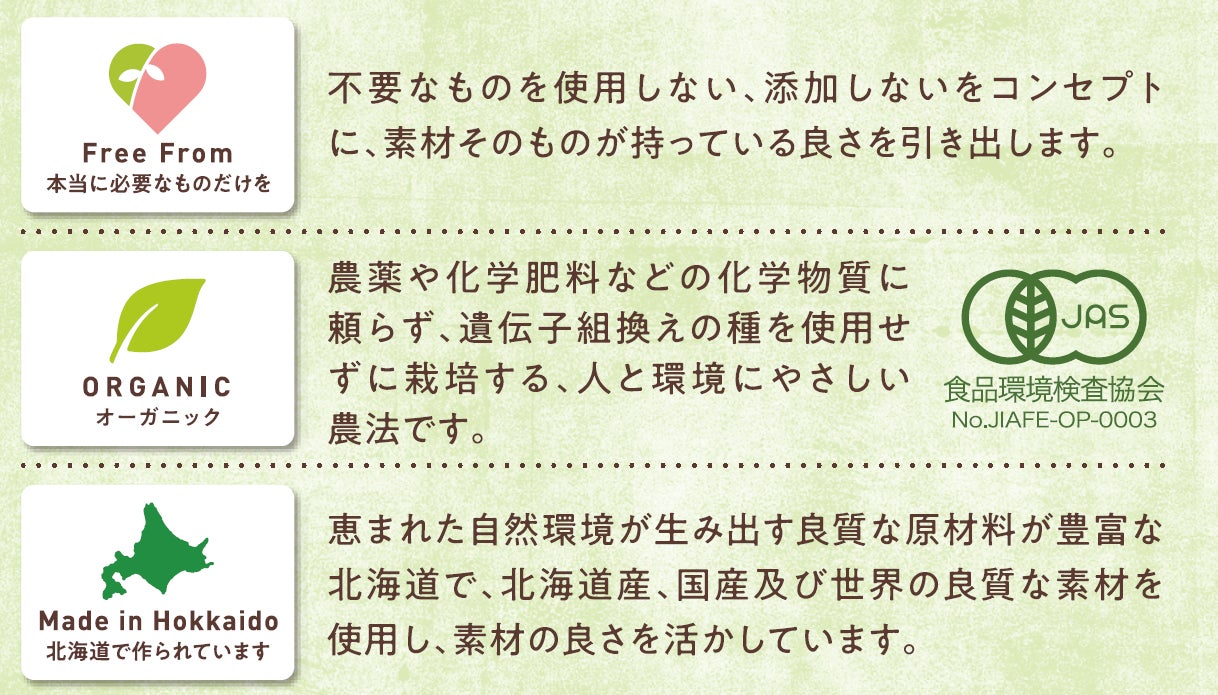 自然の素材が持っている味、 栄養、 良さを活かした食品づくりを目指します。 オーガニック、 北海道産、 国産又は世界の良質な素材を使用し、 シンプルな製法で、 最低限の加工をし、 素材の持つ良さを引き出した製品をお届けします。