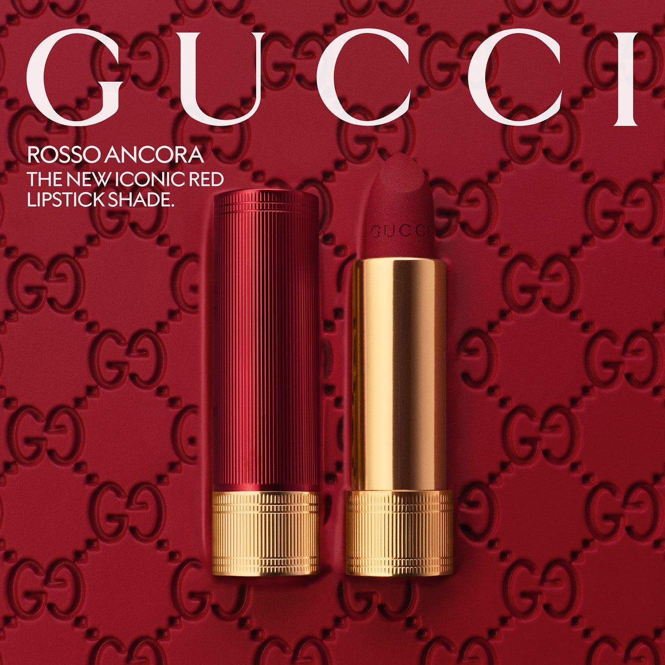 グッチ ルージュ ア レーヴル マット グッチ ロッソ アンコーラは、リップスティックと同様の象徴的なレッドに彩られたパッケージに収められています。これまでのグッチ ルージュ ア レーヴル マット リップスティックではゴールドメタルカラーで彩られていたチューブキャップがグッチ ロッソ アンコーラ カラーで再解釈され、繊細なストライプの装飾がレッドの輝きを放ちます。アウターボックスもグッチ ロッソ アンコーラで彩られ、グッチの新たなシグネチャーカラーの魅力を表現しています。