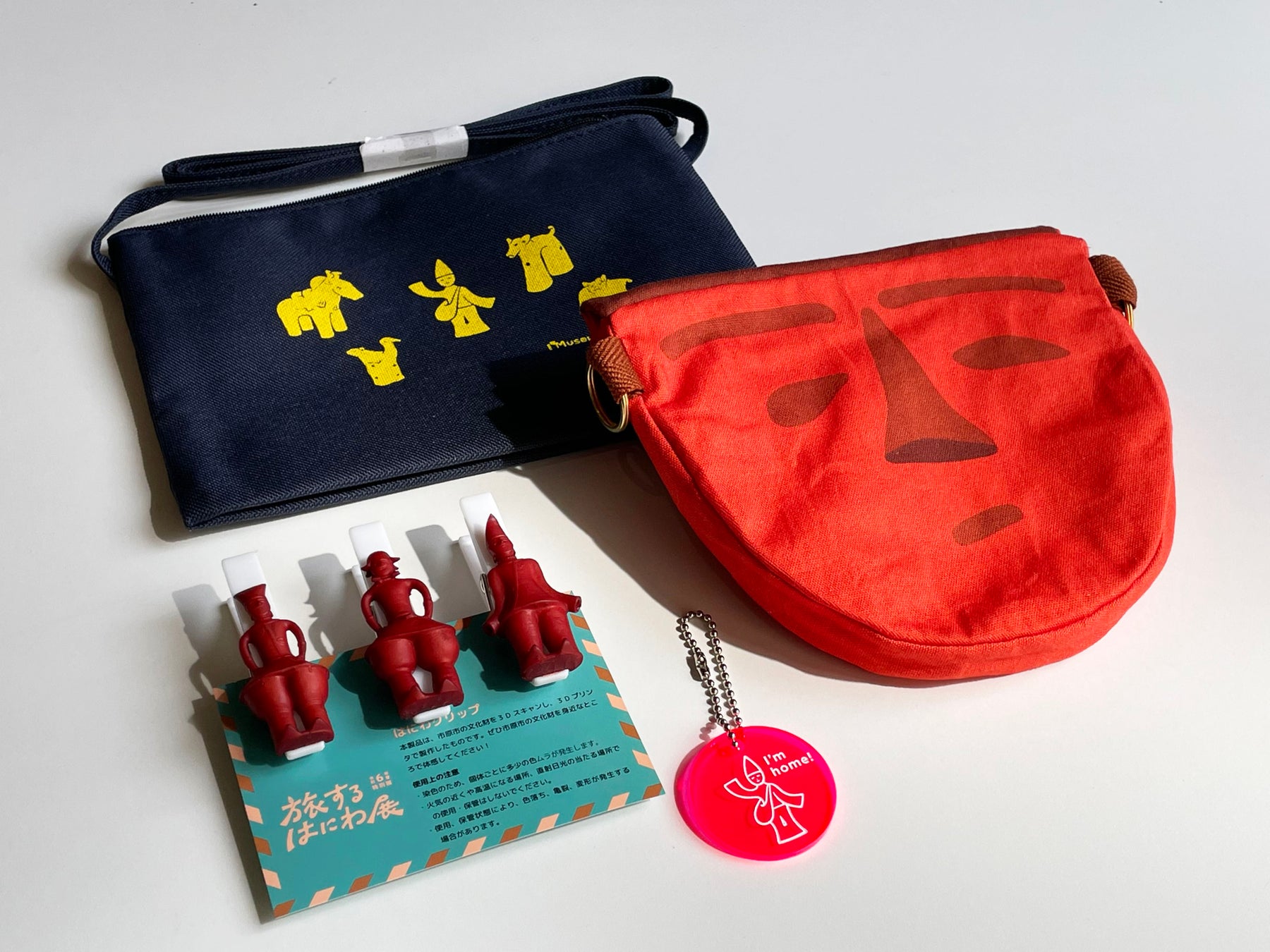 「旅するはにわ」をイメージしたグッズも充実しています。千葉大学とコラボしたクリアホルダー、マグネットクリップ、ハンドメイドポーチのほか、スーツケースなどに付けるラゲージタグ(荷札)、アクリルキーホルダー、サコッシュ、ポストカードなど「旅」に便利なグッズも多数そろえています。