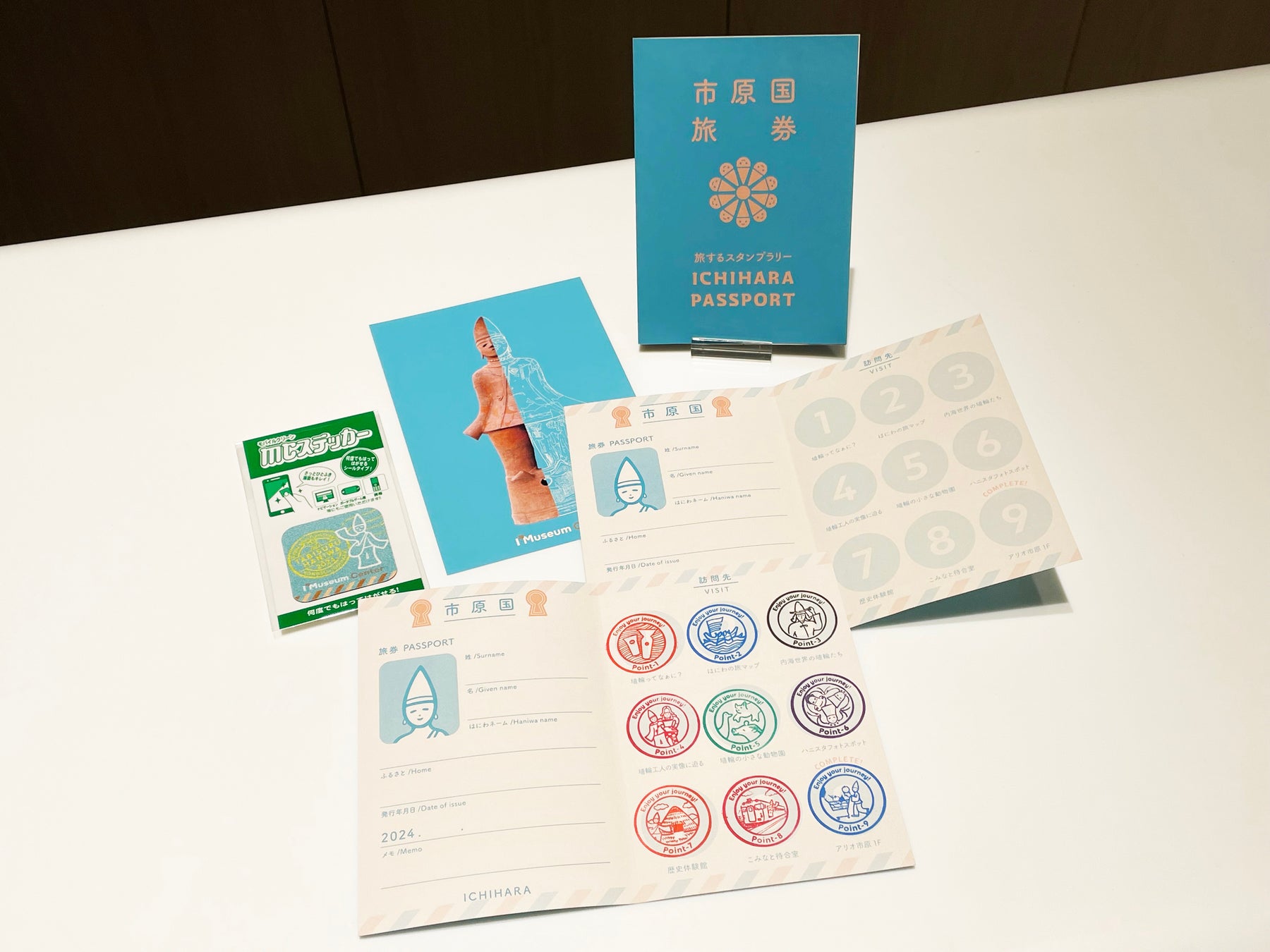 「旅するはにわ」のテーマに合わせ、来館者が楽しめるスタンプラリーも開催しています。館内・敷地内展示スペース7か所、それ以外の市内スポット2か所を巡りスタンプを集めると、記念のはにわグッズがもれなくもらえます。「旅券」型のシートを入手して参加できます。