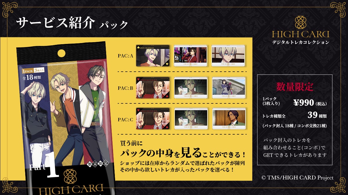 サービス開始に伴い、「HIGH CARD デジタルトレカコレクション Part1」の先行販売を開始しました。 こちらは「HIGH CARD デジタルトレカコレクション Part1」のパック在庫の一部を先行で販売するセールとなっております。 こちらは期間限定、320パック・少量限定での販売となります。