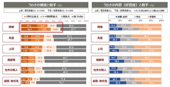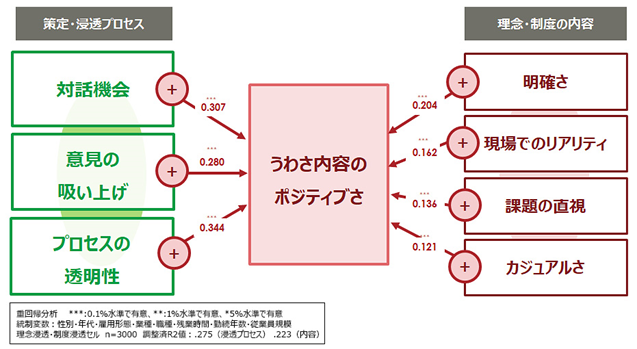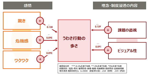 また、今回の調査で明らかになったのは、理念や制度は従業員にただ伝達されるだけでなく従業員同士のうわさ行動によって「シェア」されており、その頻度やポジティブさもまた、浸透施策のあり方に大きく左右されているということである。