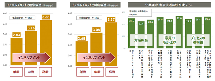 ⑧ 理念や制度の浸透には、策定・浸透プロセスにおける従業員のインボルブメント(関与・参画・共感)の度合いが大きくプラスの関係にある。策定・浸透プロセスにおける対話機会、意見の吸い上げ、プロセスの透明性がインボルブメントを上昇させる傾向が見られた。