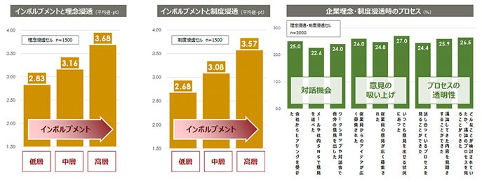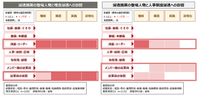⑧ 理念や制度の浸透には、策定・浸透プロセスにおける従業員のインボルブメント(関与・参画・共感の実感)の度合いが大きくプラスの関係にある。対話機会、意見の吸い上げ、プロセスの透明性がインボルブメントを上昇させる傾向が見られた。
