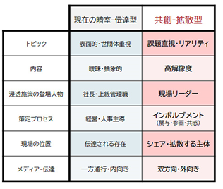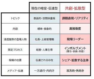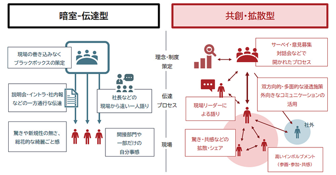 本調査から見えてきたことは、理念も制度も、経営や管理部門が決めたものを下に伝達する「暗室-伝達型」から、現場の巻き込みとリアリティを重視する「共創-拡散型」へと大きく変化する必要があるということだ。