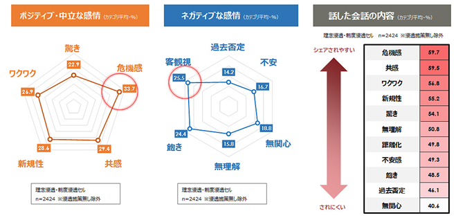 ⑬ 浸透施策に抱いた感情を測定すると、「時代が変わったと感じた」などの「危機感」が高く、「冷静に評価した」などの「客観視」が高い。うわさの内容として話されやすいのは、「危機感」「共感」「ワクワク」「新規性」「驚き」といった感情。