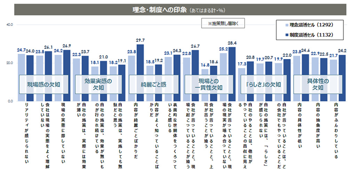 「現場の現実がかみ合っていない」などの「現場との一貫性欠如」も高め。全体的に制度の方が印象が悪い。