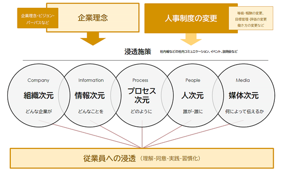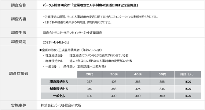労働力不足や成長の鈍化、価値観の多様化、テレワークの普及・定着といった社会や企業、働き方の変化を背景に、企業理念や人事制度の重要性は増しています。本調査は、企業理念と人事制度に関する社内コミュニケーションや浸透施策を下記の5つの次元―「組織」「情報」「プロセス」「人」「媒体」次元―に分けて定量的な検証を行い、浸透の効果やその要因、課題を明らかにすることを目的に実施しました。