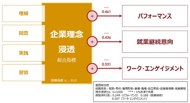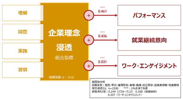 ④ 理念の浸透は、個人のパフォーマンス・就業継続意向・ワーク・エンゲイジメントとのプラスの関係が見られる。