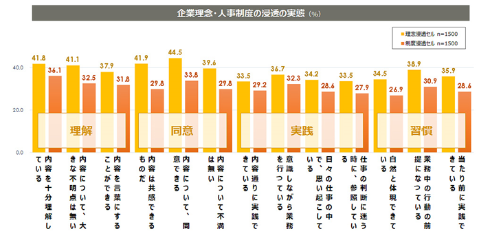 浸透度の実態は企業理念が40%、人事制度が30%程度