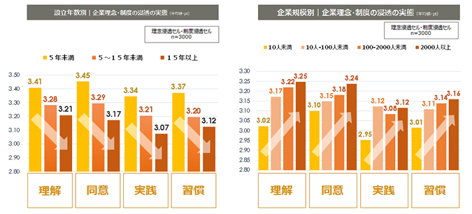 ② 理念・制度の浸透度は、企業の設立年数が古くなるほど低く、企業の規模が大きくなるほど高い。