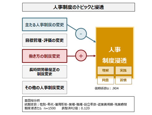 ⑤ 人事制度については、主たる人事制度(処遇・等級など)の変更は浸透しにくく、働き方関連の制度は浸透しやすい傾向。