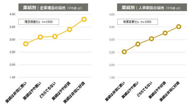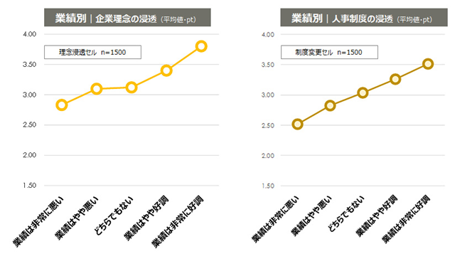 ③ 企業の業績別には、業績の悪い企業のほうが、理念・制度ともに浸透度が低い。